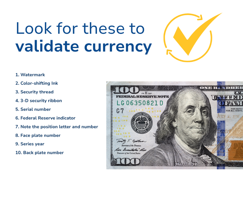 Knowing how to spot counterfeit money is the first step, but knowing what to do next protects your business, people, and profits. Follow these steps to protect your business: